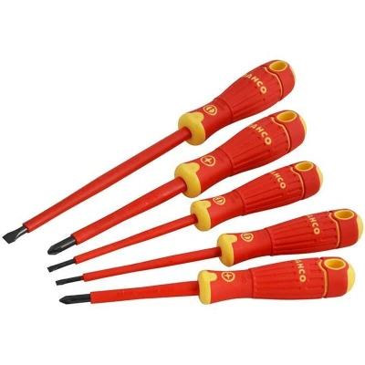 General description This is a set of five insulated screwdrivers designed for both flat-head (slotted) and Pozidriv screws. The screwdrivers feature high-quality, high-performance steel blades with a phosphatized finish for improved precision and a secure fit in screws. The bi-material handles, with over 75% rubber content, include vertical anti-slip grooves and a soft, comfortable grip for maximum torque and ease of use. Each handle has markings for quick size identification and an integrated hanging hole for convenient storage. The blades are directly molded with insulation made from a high-performance steel alloy, suitable for working on live electrical components up to 1000V. The screwdrivers are individually tested and manufactured according to IEC 60900 standards, including water bath testing at 10,000V for safety and reliability. Technical specifications Number of tools: 5 Weight: approximately 450 grams Blade material: high-performance alloy steel with phosphatized finish