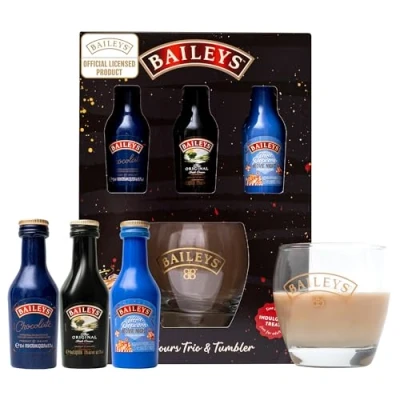 Baileys Gift Set: Enjoy the smooth, velvety taste of Baileys on its own or over ice. This miniature baileys Irish cream gift set includes mini alcohol bottles and Baileys Glass Tumbler x 3 5cl; Chocolate 15.7% ABV, Toffee Popcorn 17% & Original 17% ABV World Famous Original Blend: Baileys Irish Cream; Silky smooth and creamy with the ultimate warming sensation. A soft aroma of Irish Whiskey and complex chocolate notes with hints of exotic vanilla Chocolate Liqueur: It’s Baileys, but not as you know it; a delicious combination of Baileys Original Irish Cream with decadent Belgian Chocolate that goes impossibly well over cake or ice cubes Toffee Popcorn: Enjoy a movie night with our limited edition Toffee Popcorn Baileys; buttery popcorn aromas, mixed with sweet creaminess and nostalgic toffee, perfect for any 'at home' movie night or gifting to your nearest and dearest World Famous Blend: The perfect Christmas gifts stocking filler and secret santa gifts or for a birthday, after dinner drink or just an indulgent treat for you to enjoy this festive season!