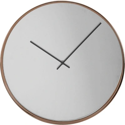 General description Its case is made from smooth metal and has a slim design that contributes to the clock's subtle aesthetic. The metal has a rose gold colour that allows the clock to be styled with warm metallic lighting and textiles. It features a mirrored face, adding to its reflective appeal. The minute and hour hands are coloured black and are slim to complement the overall design. Technical specifications Dimensions: w40 x d6 x h40 cm