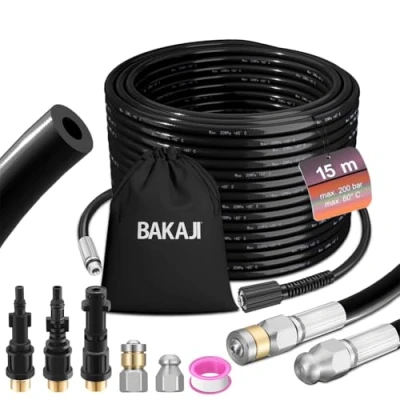 Free up pipes and blocked drains without the use of chemicals and detergents with the new BAKAJI pressure washer probe. Fits perfectly on most commercially available pressure washers thanks to the supplied adapters, compatible with Kärcher K2-K7 LAVOR pressure washers. Jobs on small construction sites can be easily solved by yourself, while plumbing work can cost a lot of time and money, from now on you can do it yourself. Thanks to its 3 adapters with a high-quality brass connection, the hose cleaning hose is compatible with almost all standard high pressure washers. The Bakaji probe is 15 m long and is made of high quality polyurethane (PU) and polyethylene (PE) with internal copper connector, can withstand a maximum pressure of 529 bar. Operating pressure: 210 bar. Very easy to use this because the pressure of the rear jet pushes the probe automatically into the pipe, with the premium nozzle you have an effective front jet, ideal for cleaning. 3 rear jets ensure reliable dirt removal. The premium rotating nozzle is suitable for even cleaning. Dirt is evenly removed from the hose with 3 rear jets on a rotating brass ring. Thanks to the backward-facing nozzles, you no longer need to push the hose forward. A durable and smooth coating made of black PU material ensures a particularly low resistance. The solid inner tube is made of white PE material and is particularly robust and is equipped with a tear-resistant, woven polyester fibre that provides robust reinforcement. Thanks to the ring indicators placed on the tube, you can monitor the progress of the probe in the pipe. The convenient carry bag for the tube, you can move around comfortably with all the accessories, without missing or losing anything., Weight: 4.960400895 pounds, Manufacturer: BAKAJI