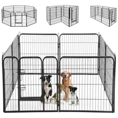 Modular and Versatile Design: This pet fencing consists of separable panels, which can be arranged in different configurations to suit the available space. Ideal for creating safe areas of various sizes and shapes for dogs, puppies and other pets. EASY ACCESS WITH BUILT-IN GATE: Equipped with a practical gate with secure closure, it allows you to enter and exit comfortably, keeping pets safe within the fenced area. The door allows for quick access and secure control, perfect for both pets and owners. Strong and stable construction: Made of robust and weather-resistant metal, this fence ensures durability and safety over time. The frame is designed to stay stable even with energetic animals, ideal for both indoor and outdoor use. Easy assembly and disassembly: The panels connect easily with each other without the need for tools, allowing for quick assembly and disassembly just as fast for transport or storage. It is perfect for those who need a practical and portable solution. SUITABLE FOR MULTIPLE PETS: This modular fencing is ideal not only for dogs and puppies, but also for other pets such as cats, rabbits and small animals. It is a great solution for those who have multiple animals or want a temporary or permanent safe zone. Safe Finish & Rounded Edges: The fence is designed with rounded edges to prevent scratches and injuries to animals, ensuring greater safety during use. The surface is powder coated to prevent rust, making it resistant to wear over time.