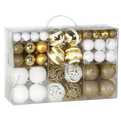 Decorate your Christmas tree with this set of 100 balls in different sizes Ø 3/4/6 cm. The balls are made of plastic in different decorations with glossy and matte surfaces. They are equipped with hook and d indicated to decorate Christmas trees both inside and outside. Supplied in a handy PVC box to store after use and store them safely and prevent them from spoiling and relinquishing. Color: White and Gold