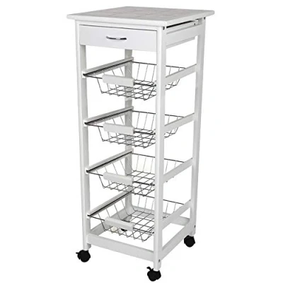 BAKAJI Space saving kitchen trolley in white MDF wood with 4 fruit baskets steel drawer cutlery tray tiled table top and swivel castors 360 degrees 37 x 82 cm