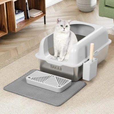BAKAJI XXL Cat Litter Tray with Steel Base Edge and Anti Sand Platform, Scoop for Collection Container Dirt Mat, Non Slip Base, Capacity 35 Litres, 60 x 40 30 cm