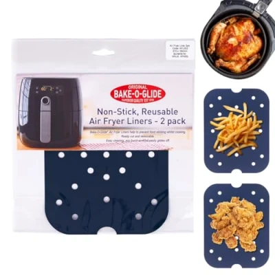 PROLONG THE LIFE OF YOUR AIR FRYER: The Bake-O-Glide Air Fryer liner has been designed to prevent food from sticking during the cooking process. Protect your air fryer whilst enjoying effortless food release and easy clean-up, making your air fryer experience easier without sacrificing the end results. Say goodbye to the frustration of scrubbing stuck-on food in your air fryer. ALLOWS YOUR AIR FRYER TO PERFORM UNIMPEDED: Constructed with perforations to help maintain the airflow around your air fryer, also allowing for oils and grease allowing to escape through the perforations. Food does not float in oil and grease like they might in alternative solid Air Fryer Liners, avoiding greasy, soggy results. NON-STICK AND REUSABLE: Our Air Fryer Liner ensures exceptional performance alongside long-lasting use. Created from the same high-quality material as our highly acclaimed Extra Thick Oven Liner, in a sleek blue colour. Enjoy the benefits of healthier cooking with a PTFE, non-stick coating. This advanced coating reduces the need for oils or sprays, helping you achieve delicious, crispy results without excess fat. Embrace guilt-free cooking and savour every bite. COOK WITH CONFIDENCE: Heat proof up to 260⁰C, allowing you to explore a wide range of culinary creations. Plus, it is dishwasher safe, making clean-up a breeze. Reusable and durable, this liner can be used thousands of times, eliminating the need for disposable alternatives. Save time and money with the Bake-O-Glide Air Fryer Liner. PACK OF TWO Bake-O-Glide Air Fryer Liners. This size is suitable for the Ninja Foodi MAX Dual Zone Air Fryer, AF400UK. However, THIS PRODUCT CAN BE CUT TO SIZE TO FIT OTHER AIR FRYERS, with a sharp pair of scissors. Dimensions: 164 x 210mm. Other sizes are available.