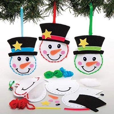 Christmas Craft: These decorations are sure to be a real hit when it comes to picking Christmas ornaments Handmade touch: This kids sewing kit lets them create a cute array of snowman faces to hang on the Christmas tree Fun for all: crafty children will enjoy practising their stitching skills and bringing these ice cool snowmen to life Each kit contains pre-cut felt templates, felt pieces, plastic needle, stuffing, wool & ribbon. Bag size measures 12cm Safety First: All Baker Ross toys and crafts satisfy stringent European Community Safety Laws and carry the CE mark. Baker Ross caters to a variety of ages and leaves it to customers to assess whether a child is old enough for any particular item.
