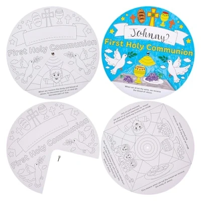 Christian Crafts: This multipack of Holy Communion colour-in wheels is perfect for teaching kids about their first communion. Each section of the wheel explains what happens during communion and why the celebration takes place. Arts and Crafts for Kids: Boys and girls of all abilities will be able to colour within the pre-drawn outlines to create perfect pictures. Kids can then add the split pins to make wheels that spin. Religious Crafts: Kids can colour-in kits with Baker Ross fibre tip pens (not included). This kit is perfect for schools, religious education, churches and Holy Communion celebrations. Included in the Pack: This pack contains 5 Kits. Story wheel is made from 350gsm matt card. Size 23cm. Made by Experts: Baker Ross has been designing and providing the very best art and craft supplies, and toys to schools, groups and parents for over 40 years. All products conform to General Product Safety Regulations, and state age recommendation where applicable.