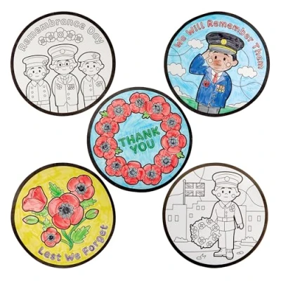 Window Decorations: Colour-in and then decorate your windows with these Remembrance pictures. Light will shine through the pictures to create stained-glass effect pictures. They're perfect for learning about Remembrance Colouring Craft Kit for Kids: The pre-drawn outlines allow boys and girls of all abilities to colour-in decorations easily. These decorations can be crafted at home, in school or at clubs. Remembrance Decorations: Kids can colour-in decorations with Baker Ross pencils or fibre tip pens (not included). Kids can then tack the designs directly onto windows, and watch the sun light up images. Included in the Pack: This pack contains 20 decorations in 10 assorted designs - including Poppies, Soldiers, wreaths and much more. Size 17cm Made by Experts: Baker Ross has been designing and providing the very best art and craft supplies, and toys to schools, groups and parents for over 40 years. All products conform to General Product Safety Regulations, and state age recommendation where applicable.