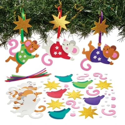 Hanging Decoration: This multipack of Christmas mice decorations is an entertaining craft activity for creative kids. These all-in-one kits have all the pieces kids need to make their own mice, that are perfect for decorating Christmas parties and celebrations Kids Craft Kit: Boys and girls of all abilities will be able to complete these simple to make foam decorations. Kids can peel and stick the self-adhesive foam pieces to create festive decorations Foam Craft Decoration: These colourful decorations are mess free and require no glue. Finish decorations by attaching the handy hanging ribbon supplied to display decorations at parties or to hang on Christmas trees Included in the Pack: This pack contains 8 kits in 8 assorted designs. Each kit includes foam template, self-adhesive foam decorations and ribbon for hanging. Mouse height 10.5cm-12cm. Instructions included. No glue required Made by Experts: Baker Ross has been designing and providing the very best art and craft supplies, and toys to schools, groups and parents for over 40 years. All products conform to General Product Safety Regulations, and state age recommendation where applicable.