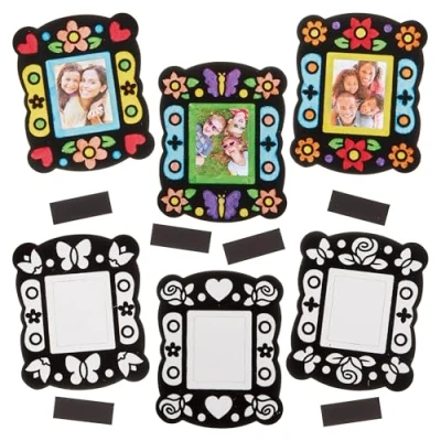 Fuzzy Arts and Crafts: Kids can create colourful picture frame magnets with these easy to complete fuzzy art kits. Kids can colour the decorative frames and then add their own photo to personalise the designs Colouring for Kids: Boys and girls of all abilities will be able to create perfect pictures every time, as the velvet outlines make it easy for kids to colour between the lines. This entertaining colouring activity is mess free and simple to complete Arts and Crafts: Kids can colour magnets with Baker Ross fibre tip pens, crayons or pencils (not included). Frames are easily turned into magnets by applying the self adhesive strip provided. Use these colour in fuzzy art kits for rainy day entertainment, fun party craft activity, or creative classroom art project Included in the Pack: This pack contains 12 kits in 6 assorted designs. Card photo frames with black velvet outlines & self-adhesive magnet strips . Size 10.5cm x 8.5cm; aperture size 43mm x 34mm. Made by Experts: Baker Ross has been designing and providing the very best art and craft supplies, and toys to schools, groups and parents for over 50 years. All products conform to General Product Safety Regulations, and state age recommendation where applicable.