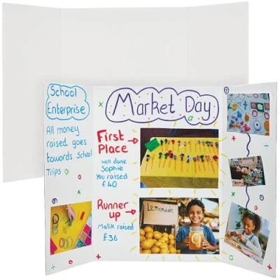 Small White Presentation Boards: Reusable, sturdy corrugated card boards designed with a tri-fold structure, making them perfect for tabletop displays and presentations. Practical and Durable: Ideal for a variety of display needs, these boards provide a solid and reliable surface for showcasing projects or information. Customisable: Pair with display rolls and borders (not included) to enhance and personalise your display boards with extra flair. Included in the pack: This pack contains 4 boards. Board size 61cm x 41cm Made by Experts: Baker Ross has been designing and providing the very best art and craft supplies, and toys to schools, groups and parents for over 50 years. All products conform to General Product Safety Regulations, and state age recommendation where applicable.