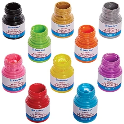 Multiuse Paints for Crafts: Our glitter Deco paint is perfect to use on our ceramic, porcelain and wood craft kits. When applied to a surface, our water-based paint leaves a super high gloss and glittery finish Kids Crafts Painting: Creative kids will enjoy personalising their craft projects by using our selection of shiny glitter colours. Our Deco paint pots are suitable painting and decorating crafts at home and in school Paints for Arts and Crafts: Our Deco paint is versatile and can be used on most surfaces including wood, porcelain, glass and paper. Paint can be heat fixed porcelain in a non pre-heated oven for 90 minutes at 160 degrees Included in the Pack: This pack contains 10 paints, in 10 assorted glitter colours - red, green, black, yellow, blue, pink, orange, purple, silver and gold. 20ml paint per pot. This paint is not suitable as finger paint Made by experts: Baker Ross has been designing and providing the very best art and craft supplies, and toys to schools, groups and parents for over 40 years. All products conform to General Product Safety Regulations, and state age recommendation where applicable.
