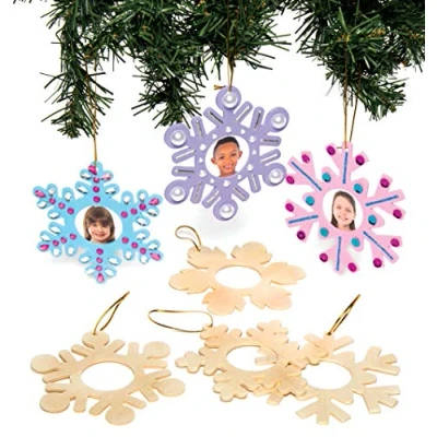 A Unique Gift: Add a photo to these Christmas baubles to decorate and make a personalised Christmas gift for friends, family, mums, dads, grandparents and more. Easy to make and decorate, everyone will love to design this photo baubles. Fun Christmas Craft: When it comes to Christmas, these wooden snowflakes for crafting can be the inspiration for the decorations themselves Add a photo inside to make it extra special Mini Christmas Decorations: These hanging snowflakes are great to add to pop on your Christmas tree, adding to a homemade wreath, or just to add a festive touch to your decorating. Decorate with acrylic/deco paints and pens, gems, glitter and sequins (not included) Shimmering Shades: this pack of wooden Christmas decorations features 4 assorted design. Snowflake Christmas ornament measures size 9.5 cm approx, aperture size approx. 3 cm diameter and is made from 3 mm thick plywood. Gold thread included. Made by experts: Baker Ross has been designing and providing the very best art and craft supplies, and toys to schools, groups and parents for over 40 years. All products conform to General Product Safety Regulations, and state age recommendation where applicable., Manufacturer: Baker Ross