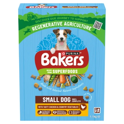 Bakers Superfoods Small Dog Chicken Dry Dog Food 1.1kg is specially formulated for small dogs, offering bite-sized pieces made from natural ingredients with no added artificial colours, flavours, or preservatives, and provides 100% complete and balanced nutrition developed by pet nutrition experts.