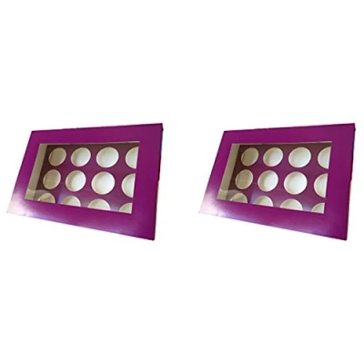 Pack of Two Purple Cupcake Boxes with Window Holds 12. Easy to assemble pop up design which makes building your boxes quick and easy. All Bakers Tool Kit cupcake boxes are made from food grade card. Can be reused up to an average of 5 times. Comes with colour coordinating matching insert which will keep your cakes secure during transit. Features a transparent window so you can see the cupcakes inside.
