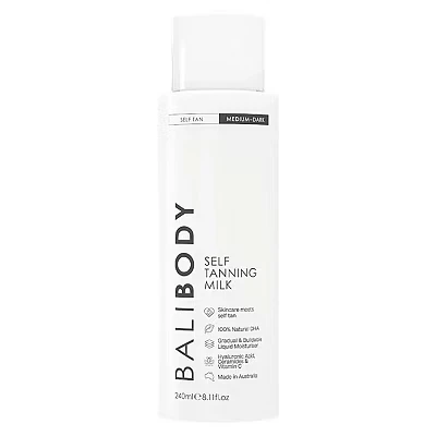 𝗖𝘂𝘀𝘁𝗼𝗺𝗶𝘇𝗮𝗯𝗹𝗲, 𝗥𝗮𝗱𝗶𝗮𝗻𝘁 𝗚𝗹𝗼𝘄: Bali Body Self Tan Milk delivers a natural, sun-kissed bronze with ease. Its lightweight, buildable self-tanning lotion lets you control the depth of your tan, leaving skin smooth, radiant, and glowing with a long-lasting, healthy bronzed finish. 𝗔𝗱𝘃𝗮𝗻𝗰𝗲𝗱 𝗦𝗸𝗶𝗻𝗰𝗮𝗿𝗲 𝗜𝗻𝗳𝘂𝘀𝗶𝗼𝗻: Enriched with hyaluronic acid, ceramides, and vitamin C, this self-tanning milk hydrates deeply, supports the skin barrier, and brightens the complexion. Experience a flawless tan lotion result with soothing, anti-aging benefits that nourish and enhance skin health with every application. 𝗙𝗮𝘀𝘁-𝗔𝗯𝘀𝗼𝗿𝗯𝗶𝗻𝗴, 𝗘𝗮𝘀𝘆 𝘁𝗼 𝗔𝗽𝗽𝗹𝘆: The lightweight, quick-drying gradual self tanner transforms into a silky, moisturizing lotion. Use the Luxe Tanning Mitt for smooth, even coverage, starting at your feet and blending upward. Your self tan develops naturally within 4–6 hours without rinsing. 𝗦𝗮𝗳𝗲 𝗳𝗼𝗿 𝗦𝗲𝗻𝘀𝗶𝘁𝗶𝘃𝗲 𝗦𝗸𝗶𝗻: Dermatologically tested and made with naturally derived ingredients, this gradual tanning lotion is safe for all skin types. The sunless tanning lotion soothes sensitive or irritated skin while delivering a healthy, streak-free, and radiant glow without harsh chemicals. 𝗣𝗿𝗼𝘂𝗱𝗹𝘆 𝗔𝘂𝘀𝘁𝗿𝗮𝗹𝗶𝗮𝗻 𝗠𝗮𝗱𝗲: Formulated in Melbourne, this 100% vegan, cruelty-free self tan milk blends ethical beauty with premium quality. Enjoy a luxurious, gradual tan that absorbs quickly, nourishes deeply, and provides long-lasting, buildable results for radiant skin you can trust.