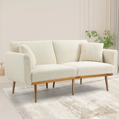 Ball & Cast 2 seater Sofa with 3 speed Adjustable Backrest, Double Thickened Padded Cushions, Couches Gold Metal Legs for Living Room and Bedroom, Teddy Upholstery, White