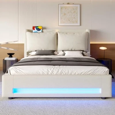 Ball & Cast 4ft Double bed frame with storage 135x190 cm storageand LED Lights, Upholstered Platform Under Storage, No Box Spring Needed, Beige Velvet