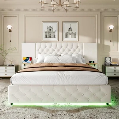Ball & Cast 4ft6 Double Bed Frame with storage, Floating Upholstered Doule Charging Station and 16colors LED Light, Metal Slats Support, Beige BedS