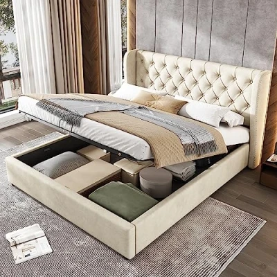 Timeless Design: The upholstered bed with nailheads and button tufted has a classic yet modern design thanks to the upholstered look; The thick headboard gives you stable and comfortable back support while reading or watching TV Stable Structure: The wooden slats minimize noise while you sleep and extend the life of your mattress. The slatted frame with a stabilizing center bar makes the bed extremely robust. In addition, support feet ensure a firm footing High Headboard to Reclining: The bed is made of velvet, its surface feels very soft and silky, but also delicate, durable, good elasticity. Thanks to the high headboard, you can sit comfortably in bed - just put some pillows behind your back and you have a comfortable place to read or watch TV Ample Storage: The unique hydraulic mattress platform with lifting function provides ample storage space under the bed for you to access in no time. You can store blankets, pillows, bed linen or toys in the large storage box under the fold-up slatted frame. The bed is ideal if you only have limited space for closets in the room Size & Easy Assembly: The high back button tufted upholstered bed frame come with clear instruction:, you can install it due to the clear instruction. Bed overall size 143 x 197 x 100cm, it fit for 135 x 190cm Mattress which is not included