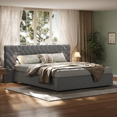 Wide Headboard Design · Comfortable Leaning Experience - The wide headboard design creates a more spacious look and provides enhanced support and a cradle-like feeling for leaning back to read or rest. Built-in Reading Light · Adjustable Angle for Comfort - The built-in reading light can be freely rotated and adjusted to suit various needs, such as nighttime reading and mobile phone use, with soft, non-glare light. Premium Velvet Fabric · Delicate, Soft, and Stylish - The gray velvet fabric has a smooth and delicate feel, a premium color, and is wear- and stain-resistant, adding a gentle and elegant ambiance to the bedroom. Hydraulic Storage Design · Intelligent Space Utilization - Equipped with a hydraulic pneumatic support structure, the bed board can be easily raised to store bedding, clothing, and other items, making it easy and secure. Solid and Atmospheric Gray Tone · Versatile Modern Bedroom - Classic gray paired with simple lines creates a modern and comfortable feel, easily integrating with various home decor styles.