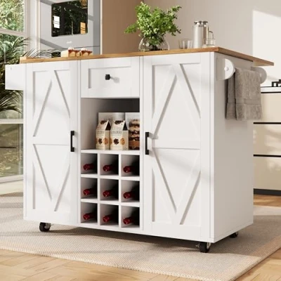 Multifunctional Kitchen Island Trolley with Foldable Dining Table:This kitchen island trolley features a unique foldable tabletop that extends into a multifunctional dining table. When unfolded (total extension 65 cm), it provides a spacious eating or prep surface—perfect for small kitchens requiring flexible and space-saving solutions. Large Storage Space with Drawer, Wine Rack & Adjustable Shelves:Designed as a practical kitchen cabinet, it includes 1 drawer, two side shelves, and a two-door cabinet with a built-in removable wine rack and snack shelves. The internal partition is triple-height-adjustable, offering organised storage for cutlery, spices, cookware, bottles, drinks and various kitchen essentials. Smooth Mobility with Locking Wheels & Stable Load Bearing:Equipped with 2 locking casters and 3 universal wheels, this serving trolley moves smoothly between the kitchen, dining room and living room. The stable frame ensures strong load-bearing capacity without tipping—ideal for everyday food prep and mobile storage. High-Quality Wood Grain MDF & Elegant Cabinet Design:Constructed from high-density wood-grain MDF, this kitchen sideboard is durable, elegant and easy to maintain. The stylish cabinet doors and modern metal handles allow it to blend naturally with contemporary home décor, making it a functional and aesthetic kitchen storage cabinet. Space-Saving Foldable Tabletop for Flexible Use:The multifunctional adjustable tabletop can be folded against the wall to transform the unit into a compact storage cabinet, or unfolded to become a full dining area. This makes it ideal for apartments, studio kitchens, or anyone needing a versatile kitchen island with storage.