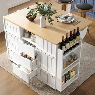 Kitchen Trolley with Wheels & Foldable Worktop:This kitchen trolley with castors features a practical foldable worktop that can be extended for dining or food preparation, and folded away to save space. Ideal as a kitchen island, serving trolley or mobile storage unit for small kitchens. White Kitchen Island with Large Storage Space:Designed as a versatile white kitchen island, this unit includes 3 drawers, sliding doors, adjustable shelves and a side rack, offering ample storage for cutlery, spices, bottles and kitchen essentials. Keep your kitchen organised and clutter-free. Sliding Doors for Easy Access & Space Saving:The kitchen cabinet with sliding doors allows smooth opening and closing without taking up extra space. Behind the doors, generous storage space provides easy access to frequently used items, perfect for everyday kitchen use. Durable Wood Grain Finish & Quality Materials:Crafted from high-density MDF with a wood grain finish, this kitchen trolley cabinet is sturdy, durable and easy to clean. The aluminium handles and 3D cabinet door design add a modern and stylish touch to your kitchen. Serving Cart with Spice Rack, Towel Rail & Wheels:Equipped with a built-in spice rack, towel rail and smooth-rolling wheels, this serving cart on wheels can be easily moved and positioned where needed. Lockable castors ensure stability during food prep or serving.