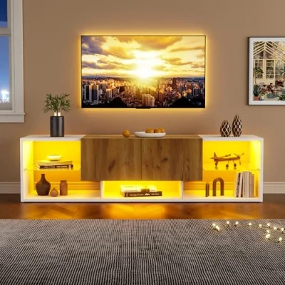 Overall Dimensions: This white and natural wood TV stand measures 160 x 40 x 42 cm and accommodates TVs up to 70 inches. It complements any home style, combining practicality and style, perfectly fitting any space. Large Storage Space: The TV stand offers ample storage space with two drawers and five open storage compartments. It's perfect for displaying accessories or items like magazines, books, or other living room essentials, keeping your living room neat and organized. Modern TV Stand: This LED TV stand is constructed of MDF, boasting a sturdy overall structure and a load capacity of up to 40 kg. The glass shelves on both sides are aesthetically pleasing. Thanks to LED lighting and high-quality craftsmanship, this living room TV stand will become your home's entertainment center, durable enough for years of use. Dimmable LED Lights: Our LED lights can be controlled via a mobile app, with a variety of lighting effects, creating a warm and inviting living room atmosphere. Whether you're relaxing, enjoying a cozy gathering, or working late, this TV stand can create the ideal atmosphere. Double Drawers: The two large center drawers are convenient for storing daily necessities like books and remote controls, and can also be used to store less frequently used items, keeping your living room clean and tidy.
