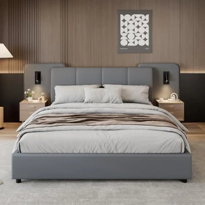 Standard Double Size: Sized at 135×190cm (4ft6 double bed), it offers ample space for a restful sleep, making it ideal for a wide range of users. Practical Tech-Ready Design: Equipped with a charging port and lighting, this upholstered bed adds convenience for daily use, keeping devices powered and providing ambient light near the bedside. Comfortable and soft: Equipped with a soft sponge-filled backrest, it is suitable for leaning back and relaxing. The bed is surrounded by impact-resistant sponge padding, providing soft impact protection. Durable Materials & Stylish Finish: Constructed with PU (smooth, easy-to-maintain surface) and plywood (sturdy structure), finished in a sleek grey color that complements various interior styles. Easy to Install: Detailed instructions and complete parts are available to help you complete the assembly. The fun of installation makes you enjoy the bed more.