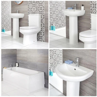 AmazonModern complete bathroom suite incorporating a 1700mm x 700mm standard single ended bath, close coupled toilet and 1 tap-hole full pedestal basin Ceramic and hard-wearing acrylic construction to ensure strength and durability 147 litre capacity bath offers resistance to wear and tear, including stains and scuffs, and features height adjustable feet for easy levelling and panels Toilet includes a dual flush cistern and soft close seat You will need a mono basin tap, deck or wall-mounted bath tap, slotted or universal basin waste, bath waste, bath and basin traps, pan connector and basin fixing kit