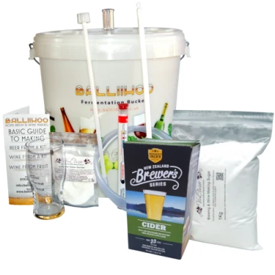 All The Basic Equipment Needed To Start Home Brewing With Instructions - Comes Complete With a 40 Pint Cider Kit and 1Kg Bag Of VinClasse Brewing Sugar. Fermentation Bucket With Temperature Indicator and Lid, Which Comes With Hole To Accept An Airlock and Is Supplied With Both An Airlock Grommet and a Blanking Grommet. Syphon Tube With Racking Cane - Hydrometer - VinClasse Cleaner Steriliser - Handy Airlock - Plastic Spoon - Instruction Sheet and Balliihoo Pint Glass. Once Your Brew Is Finished You Will Require Bottles Or Barrel (Not Included). Re Use Your Equipment To Make Any Beer Ingredient Kit. With A Huge Range Of Beers, Lagers, Ciders and Stouts Available (over 100 Ingredient Kits To Choose From) Tony's TipsIt's surprising how many Bits and Pieces one needs at the outset when the decision to "Do A Homebrew" has been made! To remove the worry of forgetting something, this Balliihoo, Basic Homebrew Starter Equipment Kit with 40 pint Cider Ingredient Kit and Sugar is a great introduction to this wonderful Sport! Yes, there are other things you will need later on; Bottles, or a Barrel, and maybe accessories like a Heating Belt, Top Pressure Valves and Gas Cartridges etc. but this is all you, or your lucky Christmas / Birthday Present Recipient will need to get started today. Play your cards right and offer to help with the first few Brews and you may well recover your outlay by receiving "Very Drinkable" Goods in Kind!