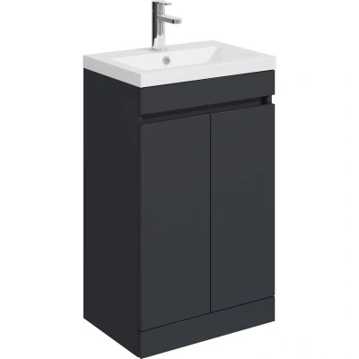 Balterley 500mm Floor Standing 2 Door Compact Unit with Polymarble Basin - Dark Grey Introduce modern style and smart storage to your bathroom with this compact floor standing vanity unit. The dark grey finish, soft close doors and integrated polymarble basin provide a complete ready-to-install solution that suits both muted and bold interiors. Ideal for small to medium bathrooms where you want clean styling, practical storage and dependable everyday performance. The Balterley 500 mm Floor Standing 2-Door Compact Unit with Polymarble Basin in Dark Grey combines contemporary design with functional storage in a versatile size. The soft close doors open to reveal hidden storage for toiletries and essentials while the integrated basin provides a ready-to-use washpoint from installation. Delivered fully assembled, the unit makes fitting quick and simple while giving you a modern, streamlined vanity setup. Product Highlights: Dark Grey Finish: A refined dark grey tone adds contemporary