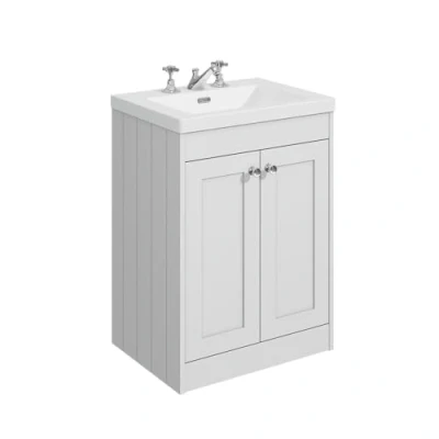 Balterley 600mm Floor Standing 2 Door Unit with Minimalist Basin 3 Tap Hole - Satin White Fresh, timeless and practical, this satin white vanity unit features a minimalist three tap hole basin and generous hidden storage. Ideal for small to medium bathrooms, it offers smooth soft close operation and arrives fully assembled. Backed by a 5 year guarantee, it provides dependable everyday convenience with clean modern style. The Balterley 600 mm Floor Standing 2 Door Unit with Minimalist Basin 3 Tap Hole in Satin White pairs modern cabinetry with a traditional three tap hole basin in a compact, user friendly design. At 600 mm wide, it delivers ample concealed storage for toiletries, towels and daily essentials, while the basin accommodates pillar taps for a timeless elegant setup. Soft close doors ensure quiet smooth use, and the pre-assembled build makes installation simple. The satin white finish provides a bright adaptable look suitable for both contemporary and classic bathrooms.
