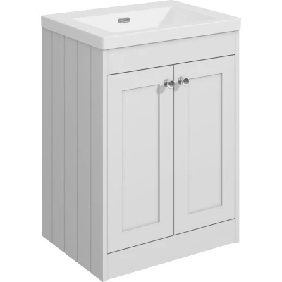 Balterley 600mm Floor Standing 2 Door Unit with Minimalist Basin No Tap Hole - Satin White Bright, modern and versatile, this satin white vanity unit features a contemporary no tap hole basin and generous hidden storage. Ideal for small to medium bathrooms, it offers smooth soft close functionality and a ready-to-install build. Backed by a 5 year guarantee, it provides reliable everyday convenience with clean contemporary style. The Balterley 600 mm Floor Standing 2 Door Unit with Minimalist Basin No Tap Hole in Satin White combines crisp styling with practical storage in a compact easy-to-place design. At 600 mm wide, it offers ample concealed space for toiletries, towels and essentials, while the basin without tap holes gives full flexibility for wall mounted or custom tap arrangements. Soft close doors ensure smooth, quiet use and the fully assembled cabinet makes installation quick and stress free. The satin white finish brings a fresh bright look that suits both modern and