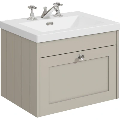 Balterley 600mm Wall Hung 1 Drawer Unit with Minimalist Basin 3 Tap Hole - Pebble Grey Subtle timeless and functional, this pebble grey vanity pairs a minimalist three tap hole basin with spacious hidden storage. Ideal for small to medium bathrooms, it arrives fully assembled, offers soft close convenience and is backed by a 5 year guarantee for reliable long term performance. The Balterley 600 mm Wall Hung 1 Drawer Unit with Minimalist Basin 3 Tap Hole in Pebble Grey combines clean cabinet styling with a basin suited to traditional pillar taps. The 600 mm drawer provides generous organised space for toiletries and essentials, while the three tap hole basin offers a classic layout within a minimalist modern shape. Soft close doors ensure smooth quiet use and the rigid pre assembled design allows quick straightforward installation. Finished in versatile pebble grey, it blends naturally with both contemporary and classic interiors. Product Highlights: Pebble Grey Finish: A calm neutral