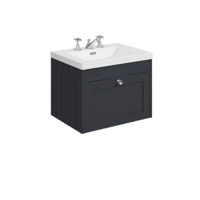 Balterley 600mm Wall Hung 1 Drawer Unit with Minimalist Basin 3 Tap Hole - Satin Dark Grey Contemporary clean and functional, this satin dark grey vanity unit pairs a minimalist 3 tap hole basin with generous hidden storage. Ideal for medium sized bathrooms it installs easily arrives fully assembled and is backed by a 5 year guarantee. The Balterley 600mm Wall Hung 1 Drawer Unit with Minimalist Basin 3 Tap Hole in Satin Dark Grey provides modern styling with classic tap versatility. The minimalist three tap hole basin accommodates pillar taps while the wide 600mm cabinet below offers generous storage for towels toiletries and essential bathroom items. Soft close doors enhance everyday use and the pre assembled build ensures quick installation. The satin dark grey finish brings a strong contemporary touch well suited to a variety of modern interiors. Product Highlights: Satin Dark Grey Finish: A smooth satin dark grey tone offers a bold modern aesthetic ideal for contemporary bathroom