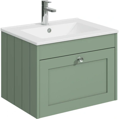 Balterley 600mm Wall Hung 1 Drawer Unit with Minimalist Basin 1 Tap Hole - Satin Green Modern clean and refreshing, this satin green wall hung vanity features a minimalist 1 tap hole basin and a smooth soft close drawer for organised everyday storage. Fully assembled and backed by a 5 year guarantee, it offers a stylish practical upgrade for small to medium bathrooms. The Balterley 600 mm Wall Hung 1 Drawer Unit with Minimalist Basin 1 Tap Hole in Satin Green delivers fresh contemporary style with useful hidden storage. The minimalist basin includes a single tap hole suited to a mono mixer tap for a streamlined look, while the wide soft close drawer provides tidy concealed space for toiletries and essentials. The wall hung format frees floor area for a more open feel and the ready built construction ensures quick straightforward fitting. Finished in calming satin green, this vanity blends modern appeal with everyday convenience. Product Highlights: Satin Green Finish: A smooth satin