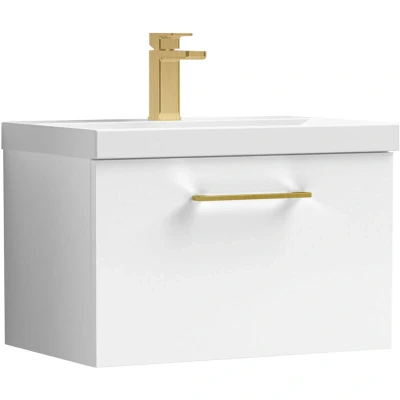 Balterley 600mm Wall Hung Bathroom 1 Drawer Vanity Unit and 1 Tap Hole Ceramic Basin, Gloss White with Brushed Brass Handle Designed to bring style and practicality together, this unit creates a clean, modern focal point in your bathroom. Its wall-hung look enhances the feeling of space while keeping essentials neatly tucked away. Perfect for everyday living. Crafted from high-quality materials, this vanity unit is built to last with a durable finish that stands up to daily use. The soft-close drawer mechanism ensures smooth, quiet operation while protecting the unit from wear and tear. Precision manufacturing delivers a sleek design with reliable performance you can trust. Product Highlights: Gloss Finish: Modern bathroom vanity unit with a high-shine gloss finish that brightens your space and makes cleaning quick and easy. Wall Hung Design: Contemporary bathroom vanity unit with a space-saving wall-hung design that enhances floor space, creates a modern floating look, and makes