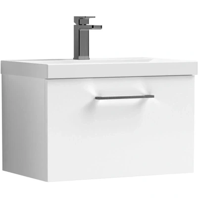 Balterley 600mm Wall Hung Bathroom 1 Drawer Vanity Unit and 1 Tap Hole Ceramic Basin, Gloss White with Brushed Pewter Handle Designed to bring style and practicality together, this unit creates a clean, modern focal point in your bathroom. Its wall-hung look enhances the feeling of space while keeping essentials neatly tucked away. Perfect for everyday living. Crafted from high-quality materials, this vanity unit is built to last with a durable finish that stands up to daily use. The soft-close drawer mechanism ensures smooth, quiet operation while protecting the unit from wear and tear. Precision manufacturing delivers a sleek design with reliable performance you can trust. Product Highlights: Gloss Finish: Modern bathroom vanity unit with a high-shine gloss finish that brightens your space and makes cleaning quick and easy. Wall Hung Design: Contemporary bathroom vanity unit with a space-saving wall-hung design that enhances floor space, creates a modern floating look, and makes