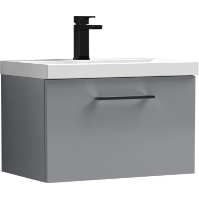 Balterley 600mm Wall Hung Bathroom 1 Drawer Vanity Unit and Tap Hole Ceramic Basin, Satin Grey with Black Handle
