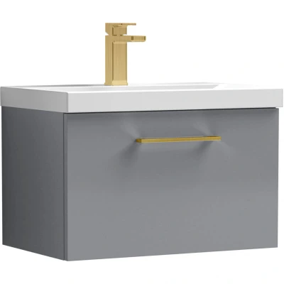 Balterley 600mm Wall Hung Bathroom 1 Drawer Vanity Unit and Tap Hole Ceramic Basin, Satin Grey with Brushed Brass Handle