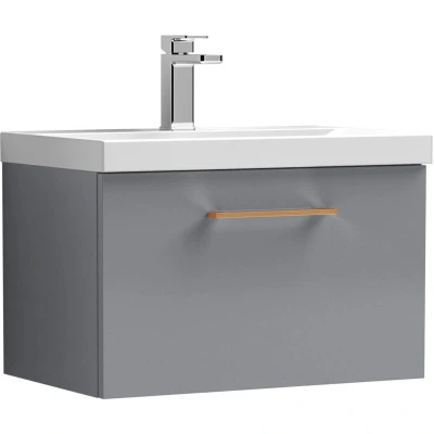 Balterley 600mm Wall Hung Bathroom 1 Drawer Vanity Unit and Tap Hole Ceramic Basin, Satin Grey with Copper Handle