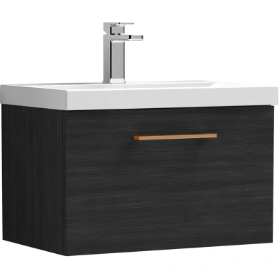 Balterley 600mm Wall Hung Bathroom 1 Drawer Vanity Unit and Tap Hole Ceramic Basin, Woodgrain Black with Copper Handle