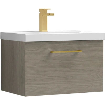 Balterley 600mm Wall Hung Bathroom 1 Drawer Vanity Unit and Tap Hole Ceramic Basin, Woodgrain Mid Oak with Brushed Brass Handle
