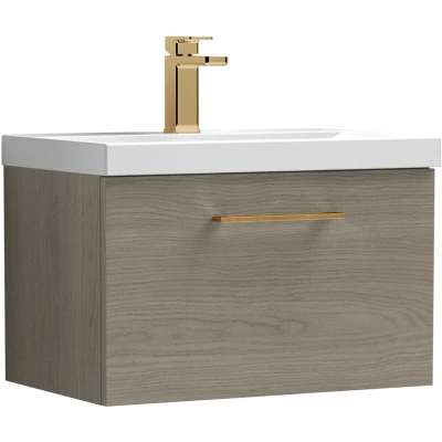 Balterley 600mm Wall Hung Bathroom 1 Drawer Vanity Unit and Tap Hole Ceramic Basin, Woodgrain Mid Oak with Brushed Bronze Handle