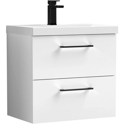 Balterley 600mm Wall Hung Bathroom 2 Drawer Vanity Unit and 1 Tap Hole Ceramic Basin, Gloss White with Black Handles Designed to bring style and practicality together, this unit creates a clean, modern focal point in your bathroom. Its wall-hung look enhances the feeling of space while keeping essentials neatly tucked away. Perfect for everyday living. Crafted from high-quality materials, this vanity unit is built to last with a durable finish that stands up to daily use. The soft-close drawer mechanism ensures smooth, quiet operation while protecting the unit from wear and tear. Precision manufacturing delivers a sleek design with reliable performance you can trust. Product Highlights: Gloss Finish: Modern bathroom vanity unit with a high-shine gloss finish that brightens your space and makes cleaning quick and easy. Wall Hung Design: Contemporary bathroom vanity unit with a space-saving wall-hung design that enhances floor space, creates a modern floating look, and makes everyday