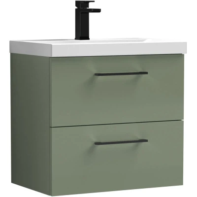 Balterley 600mm Wall Hung Bathroom 2 Drawer Vanity Unit and 1 Tap Hole Ceramic Basin, Satin Green with Black Handles