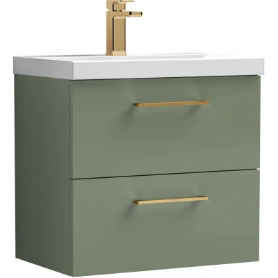 Balterley 600mm Wall Hung Bathroom 2 Drawer Vanity Unit and 1 Tap Hole Ceramic Basin, Satin Green with Brushed Bronze Handles