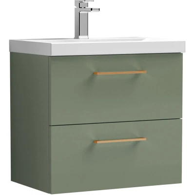 Balterley 600mm Wall Hung Bathroom 2 Drawer Vanity Unit and 1 Tap Hole Ceramic Basin, Satin Green with Copper Handles Designed to bring style and practicality together, this unit creates a clean, modern focal point in your bathroom. Its wall-hung look enhances the feeling of space while keeping essentials neatly tucked away. Perfect for everyday living. Crafted from high-quality materials, this vanity unit is built to last with a durable finish that stands up to daily use. The soft-close drawer mechanism ensures smooth, quiet operation while protecting the unit from wear and tear. Precision manufacturing delivers a sleek design with reliable performance you can trust. Product Highlights: Satin Finish: Elegant bathroom vanity unit with a smooth satin finish that adds timeless sophistication and a touch of luxury. Wall Hung Design: Contemporary bathroom vanity unit with a space-saving wall-hung design that enhances floor space, creates a modern floating look, and makes everyday cleaning