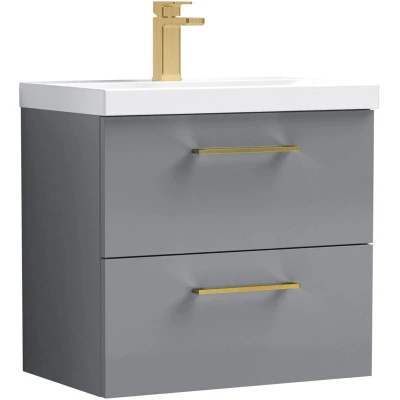 Balterley 600mm Wall Hung Bathroom 2 Drawer Vanity Unit and 1 Tap Hole Ceramic Basin, Satin Grey with Brushed Brass Handles
